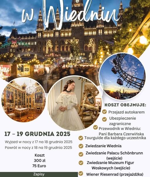 Zapraszamy serdecznie uczniów z klas siódmych oraz ósmych na wycieczkę na Jarmark Bożonarodzeniowy do Wiednia. Zgłoszenia do p. Anny Kamińskiej – Woźniak.