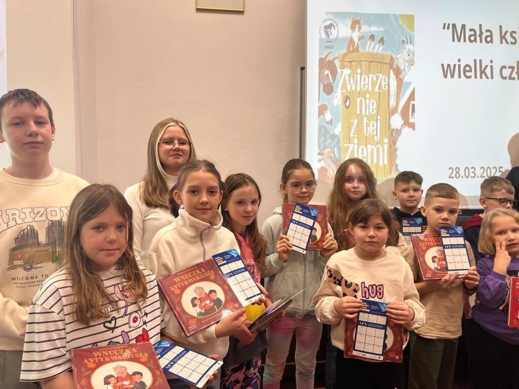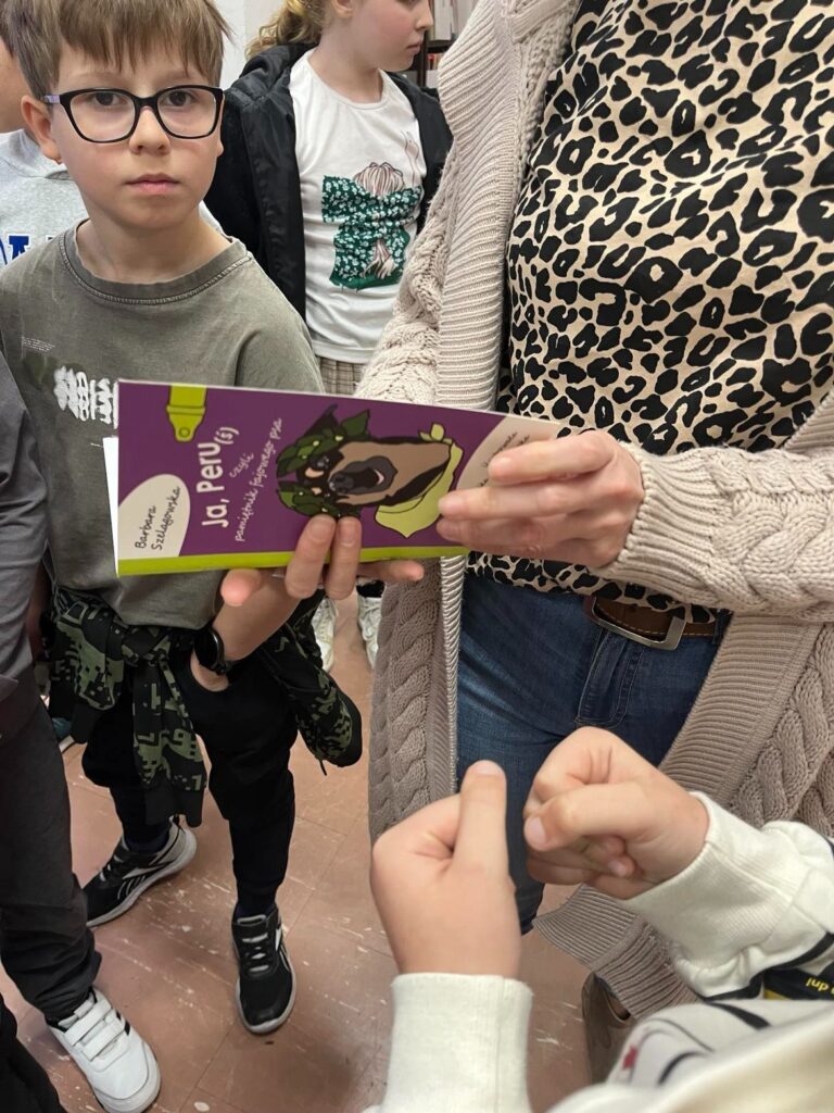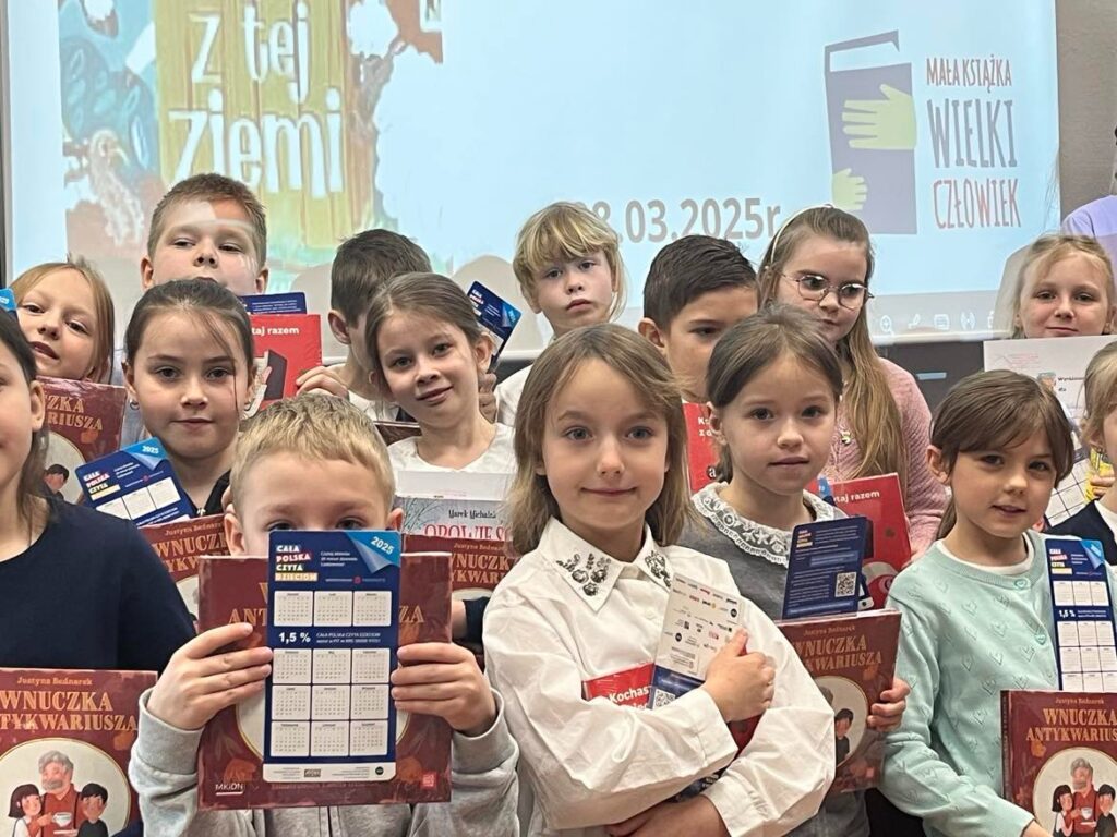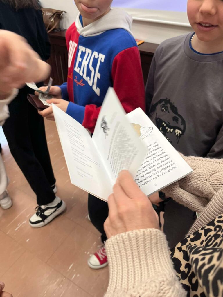 Na zakończenie spotkania każde dziecko otrzymało książkę „Wnuczka antywariusza” Justyny Bednarek broszurę dla rodziców nt. roli głośnego czytania dzieciom oraz zakładkę kalendarzyk z funadcji „Cała Polska Czyta Dzieciom”, która wspiera naszą szkołe w działaniach na rzecz rozwoju czytelnictwa.
