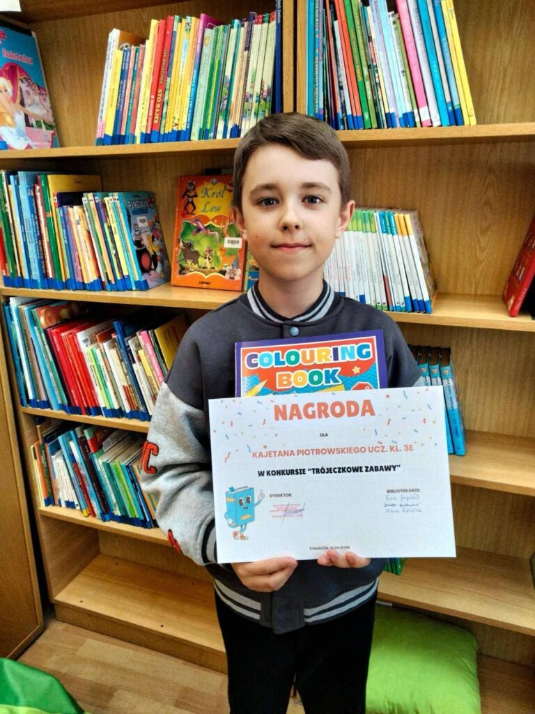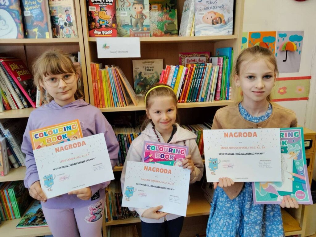 W kolejnym konkursie „Trójeczkowe zabawy – kolorowanka motyl za piękną malowankę nagrody otrzymali: Lena Langa kl. 3a, Paulina Sobieraj kl. 1c, Emilia Zdrojewska kl. 3a, Antonina Zembrzuska kl. 1d, Kajetan Piotrowski kl. 3e.