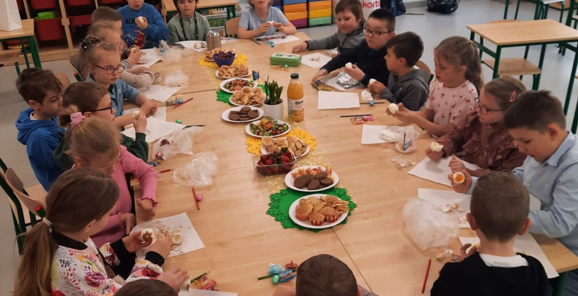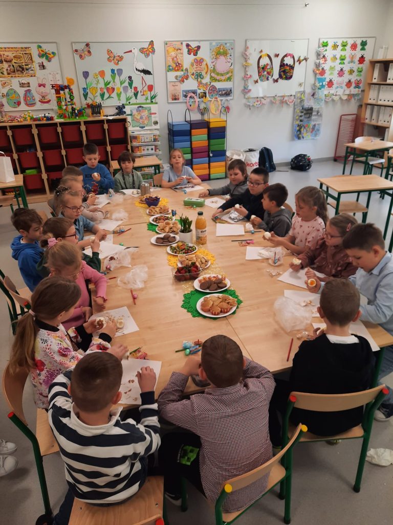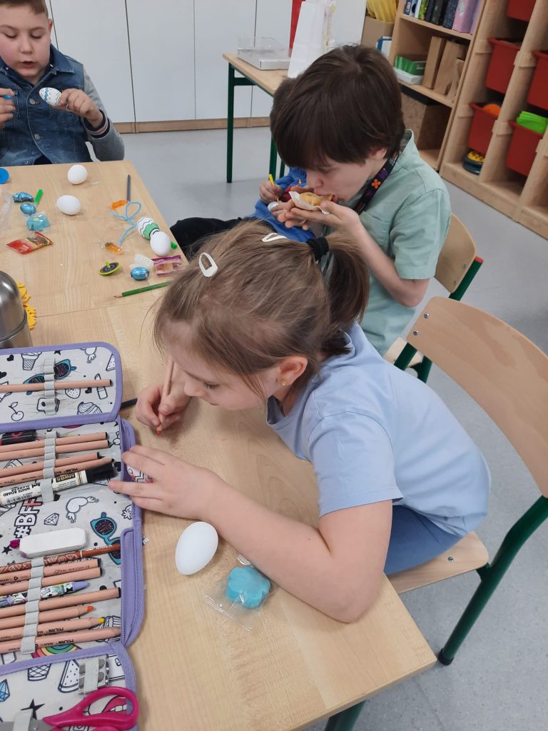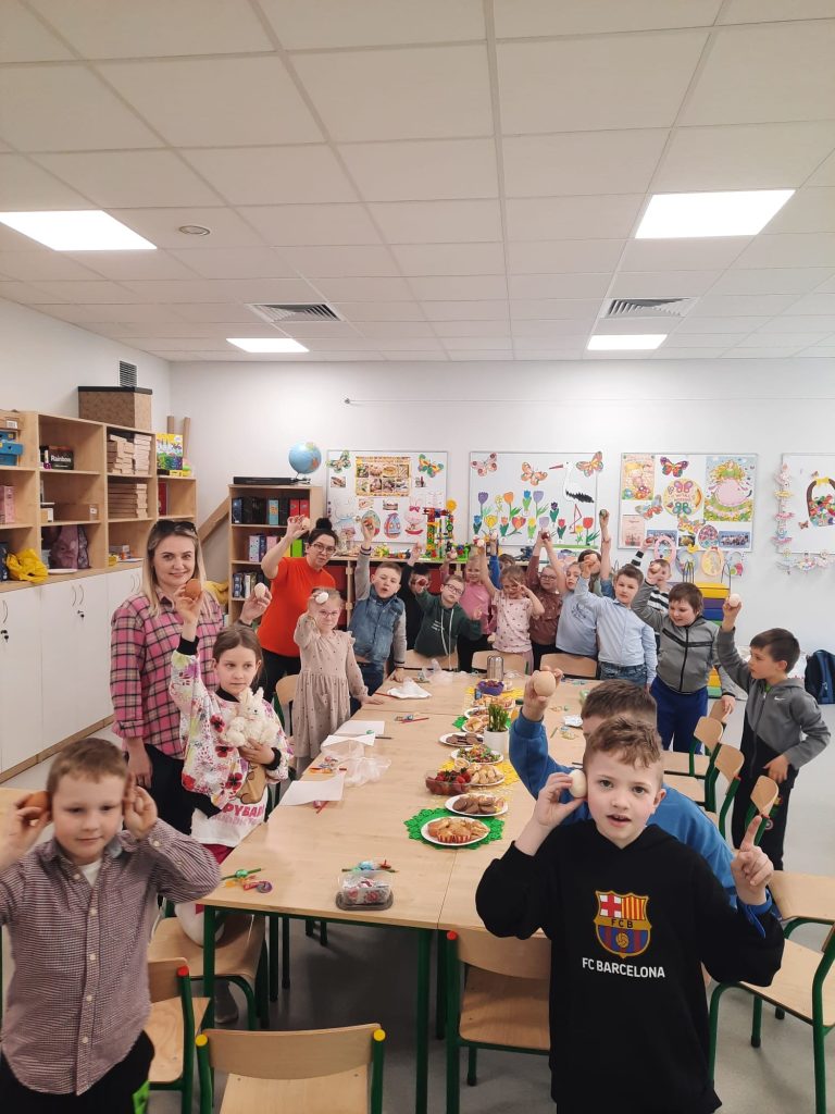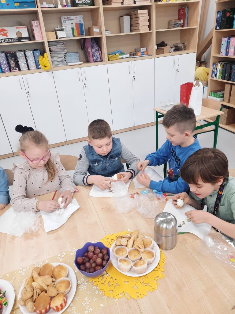 Następnie przygotowaliśmy wspólny stół, żeby staropolską tradycją stuknąć się jajkiem i złożyć sobie życzenia. Na koniec ozdabialiśmy pisanki.